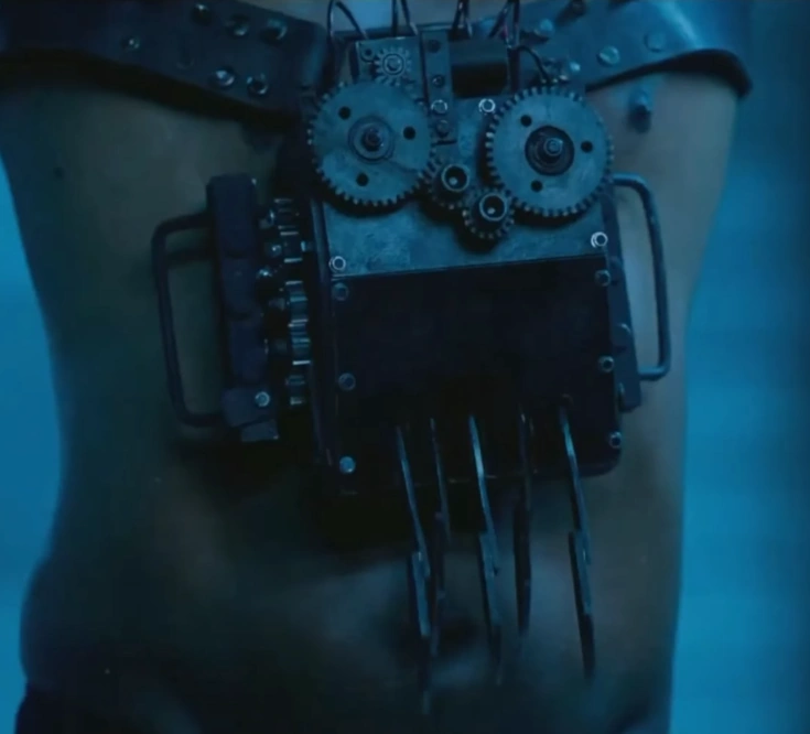 The trap consists of a device design to slash the lower abdominal open with 5 sharp blades on a large mechanical box connected to the then hung up person by leather straps. It's unknown how the sharp tools would have actually reached the wearer's stomach as they appear to just move in a non-moving pattern though flesh cutting can be briefly heard before the scene cuts to black meaning the sharp side was the side facing the wearer and the scalpel like objects would move back and slowly dig into the stomach, disemboweling the test subject. No instructions are given for the test and it’s unknown if it was winnable though it isn't fully like John Kramer to create a purposefully unwinnable trap so it is possible instructions were given off screen.