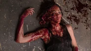 In the next room, the survivors learn that one of them, a young woman named Carly, accidentally caused an asthmatic woman's death when she stole the latter's purse, which contained the woman's inhaler. Meanwhile, three syringes are presented to the prisoners, each marked with different numbers - one holds the antidote for a poison injected into Carly's system, one contains a saline solution, and the last contains hydrofluoric acid. Carly must pick the right needle while the chains pull the prisoners toward the ceiling. However, as she refuses to do so, her fellow prisoner, Ryan, ultimately grabs the syringes and injects all three of them into her neck. Carly is killed by the acid, whereas the others are released from their shackles. Following her demise, the remaining survivors discover that the correct needle was marked with "3,53" - the same amount of money Carly stole from the asthmatic woman. Another set of numbers on the needle's plunger allows them to open a combination lock securing the door to the next room.