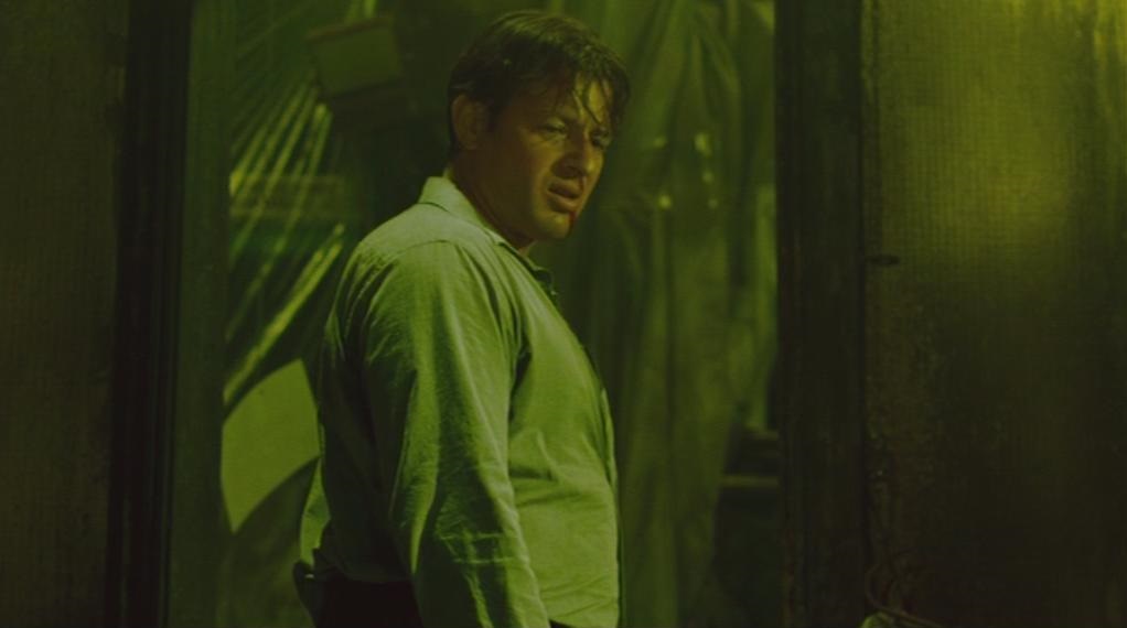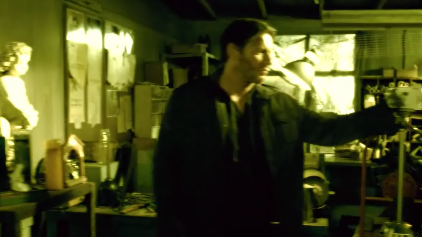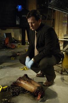 When he arrived there, the police had already found the crime scene at the zoo. Upon entering the hangar, Hoffman immediately grabbed a crate with medical supplies. While he stitched up his wound in front of a mirror, he listened to a news report on the TV, according to which up to seven people might have survived the massacre at the Rowan Zoological Institute. Despite being in horrible pain, Hoffman was able to successfully treat his wounds. Assuming that soon afterwards everyone would know his identity, Hoffman anticipated that he would have to go into hiding for a longer time. Therefore, he burnt all of his identification documents and smashed his mobile with a hammer, making it impossible for anyone to locate his position. After that, he began to plan his revenge on Jill. (Saw 3D)