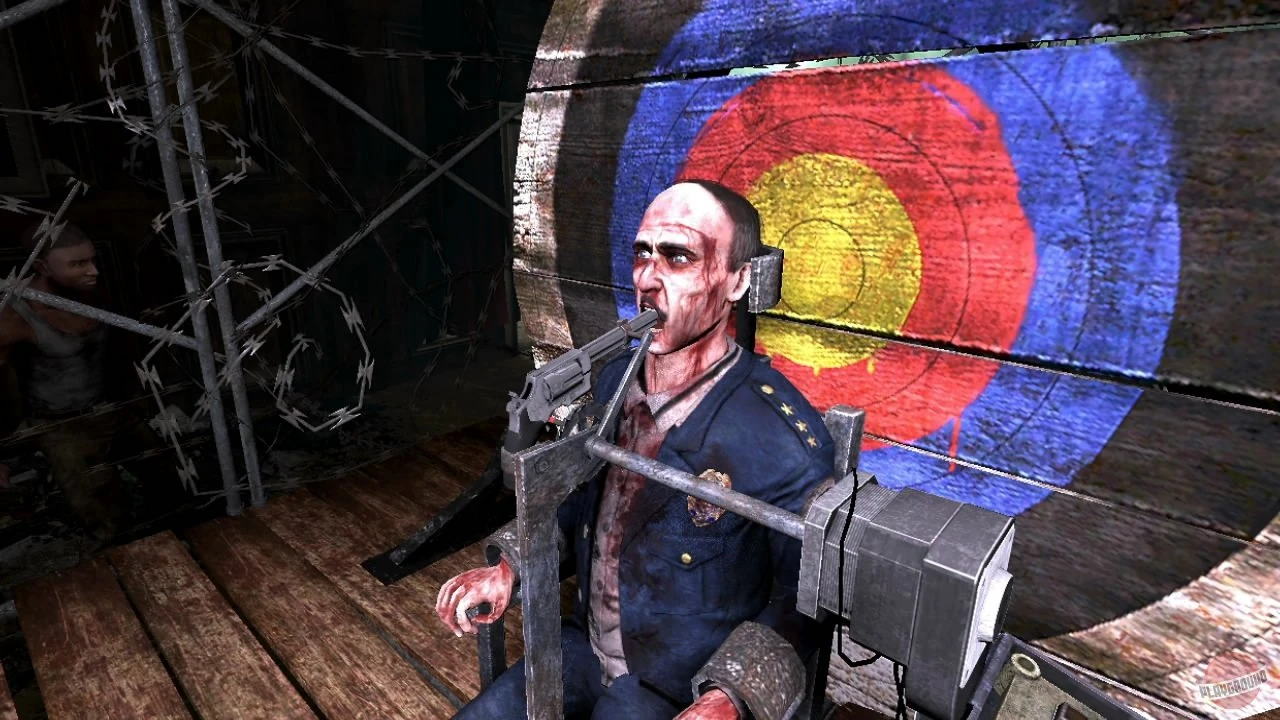 After his death, another door opened behind Michael, allowing him to go on. As he traversed the next area, he witnessed a conversation between Henry and Joseph Poltzer. Henry gave his gun to Joseph and told him that Michael mustn't survive as he knew too much about their involvement in the drug cartel. Afterwards, they separated and Michael went on once he was alone. Moments later, he reached the influent pipes. Upon passing the area, he came across a door secured by a combination lock. He noticed several green, red and blue lines painted on the floor and the walls. From the right perspective, these lines formed the numbers 485, which allowed Michael to open the door.