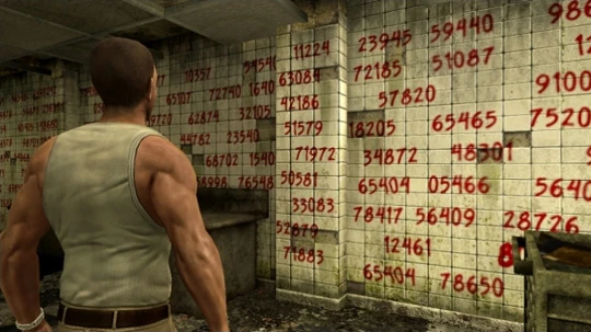 As Michael looked around the room, he pushed a crate with mattresses out of the way and found a hidden gap in the wall through which he escaped the chamber. However, the next obstacle was already waiting for him. Before him was a door secured by a combination lock. A table was written on one of the walls. The first row contained the letters A to M, while the second contained various numbers. Through a peephole, Michael read the message "Prove you deserve a second chance" on a wall in the next room, with the letters S, O, and N highlighted and underlined. When he turned off the light, another table with the letters N to Z appeared, as it had been painted with fluorescent color and was only visible in the dark. Thereby, Michael found the correct combination, 732, and opened the door. Behind it, he found another door. However, as Michael opened it, he was almost killed by a shotgun positioned above it. After barely escaping the shot, he entered the next room that Solomon must have passed after escaping from his cage. Michael then entered an elevator and rode up.