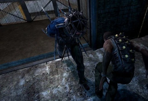 Upon going on, he entered another large storage hall. There, Michael was attacked by Donovan, another prisoner who wore a cage-like contraption on his head. Furthermore, he was forced to wear another device with several even bigger spikes on his body. Donovan tried to prevent Michael from passing the area and ran toward him to kill him. Michael tried to evade his attacks whenever he rushed forward, causing the spikes to get stuck in the wooden crates around the area. Afterward, he used the opportunity to attack Donovan with whatever weapons he could find and eventually knocked him down. When Donovan was unconscious, the exit door opened, and Michael left him behind to continue his way. (Saw II: Flesh & Blood)