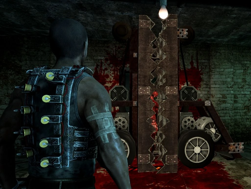 As he traversed the lower area, he soon reached the elevator. However, his path was blocked by a barrier made of wooden beams and razor wire, forcing him to find another way. In the next room, he saw an electronically locked door. He had to push a cart against a pressure plate to open it. Unfortunately for him, several bare cables lay on the floor between the cart and its destination. Therefore, Michael had to deactivate a nearby generator before opening the door. In the next room, several more carts blocked his way, and he had to push and pull them in the right way to free his path. However, Michael could not stay in the area for long as there were sensors that activated his vest. Because of that, he either had to hurry up or retreat occasionally. Furthermore, Barry, the insane pyromaniac he had already briefly encountered in the hotel, appeared on a catwalk above him and attacked him with Molotov cocktails.