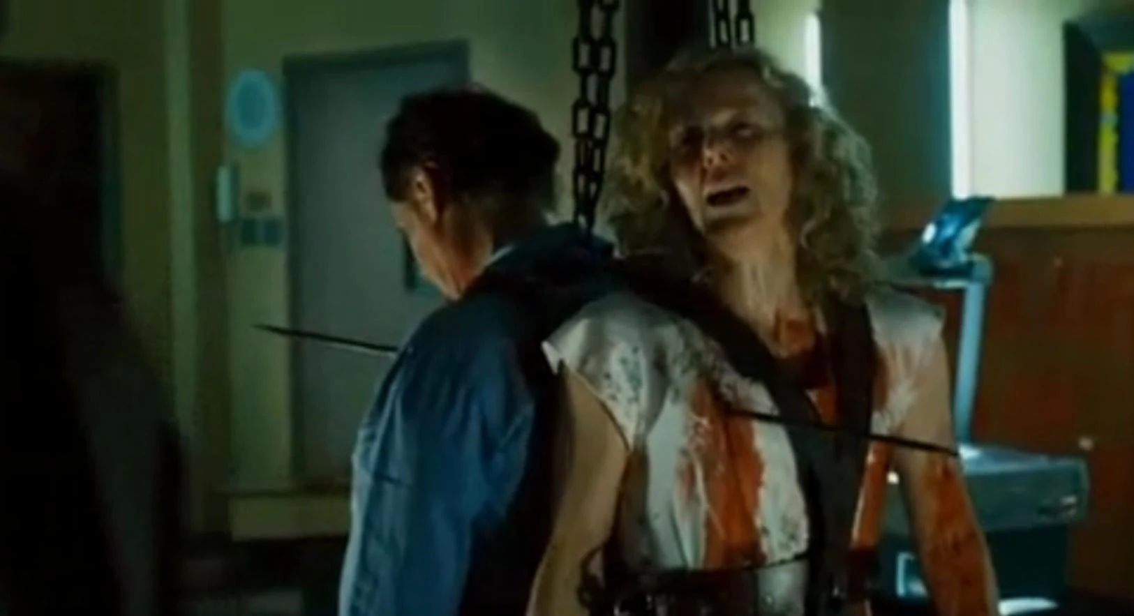 Years later, Morgan was eventually targeted by John Kramer, better known as the Jigsaw Killer, as her passivity allowed herself and her daughter to be violated and abused by Rex. At this point, Art Blank, the lawyer of Rex, had become one of John's victims as well and was forced to wear a device which would cut his spine and kill him if he didn't follow the orders given to him. Therefore, he abducted Rex and Morgan and took them to a classroom at the elementary school. After that, he put a leather harness on them and chained them back to back to a metal column in the middle of the room. Then, Art used a dangerous device, which worked similar to a nailgun, and shot eight long, thin metal spikes through their bodies. While Morgan only received severe flesh wounds, Rex was mortally wounded as the spikes had pierced his major arteries. After that, Art chained a tape recorder to Morgan's wrist which contained the instructions for her test. Additionally, he positioned a chart of the human body in front of Morgan and a wooden chart with the words "Her life is in her hands" in front of Rex and also hung up numerous X-rays of the broken bones and injuries Morgan had received from Rex in the past. Having finished the preparations, Art went on and also set up a test for Officer Rigg, who was planned to arrive at the school shortly after Morgan's test. Therefore, he set up a timer, placed a second tape recorder for him on a table and placed a box with a photo of Tracy, Rigg's wife, behind the body chart. After that, he wrote the words "Save As I Save" on the blackboard and finally left the building. (Saw IV)