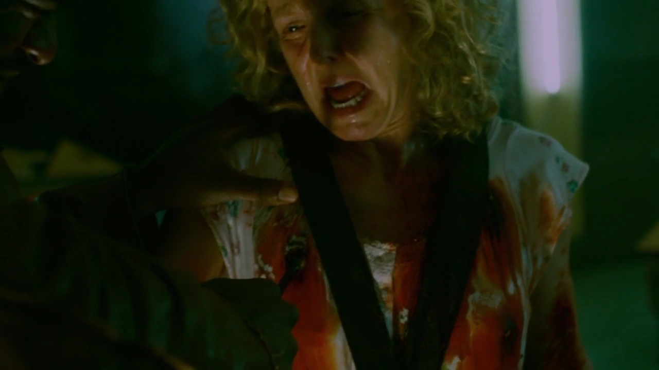 Shortly afterwards, Morgan eventually woke up. Immediately frightened by the situation, she began to scream and played the tape attached to her wrist. This message, recorded by John Kramer, told her what she had to do in order to survive. If she wanted to live, she had to pull out the spikes from her body. However, this would inevitably kill her husband. Despite this, Morgan barely hesitated and began to pull out the spikes as soon as the tape ended. Rex, who had woken up by her screams, panicked and tried to prevent her from doing so. Unfortunately, Morgan removed all but one of the spikes, causing Rex to succumb to his wounds. (Saw IV)