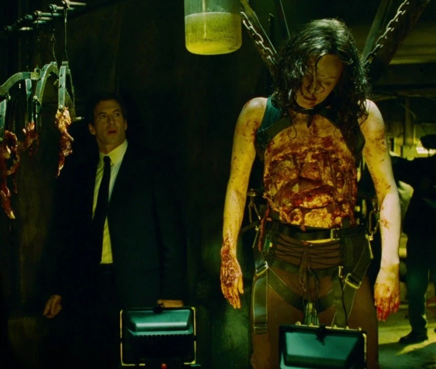 Moments later, Hoffman was transported to another room nearby where he was able to open and leave the coffin. He returned to the hallway and used a switch which caused the walls that killed Strahm to return to their original position. Upon reentering the room, he saw Strahm's mutilated corpse which was still clinging to a grate at the ceiling with one hand. When he approached it, it fell down to the floor. However Hoffman realized that the now severed hand, which still clung to the grate, was almost unharmed. Therefore he removed it by using pliers and took it with him in order to use it to place Strahm's fingerprints on his future crime scenes.