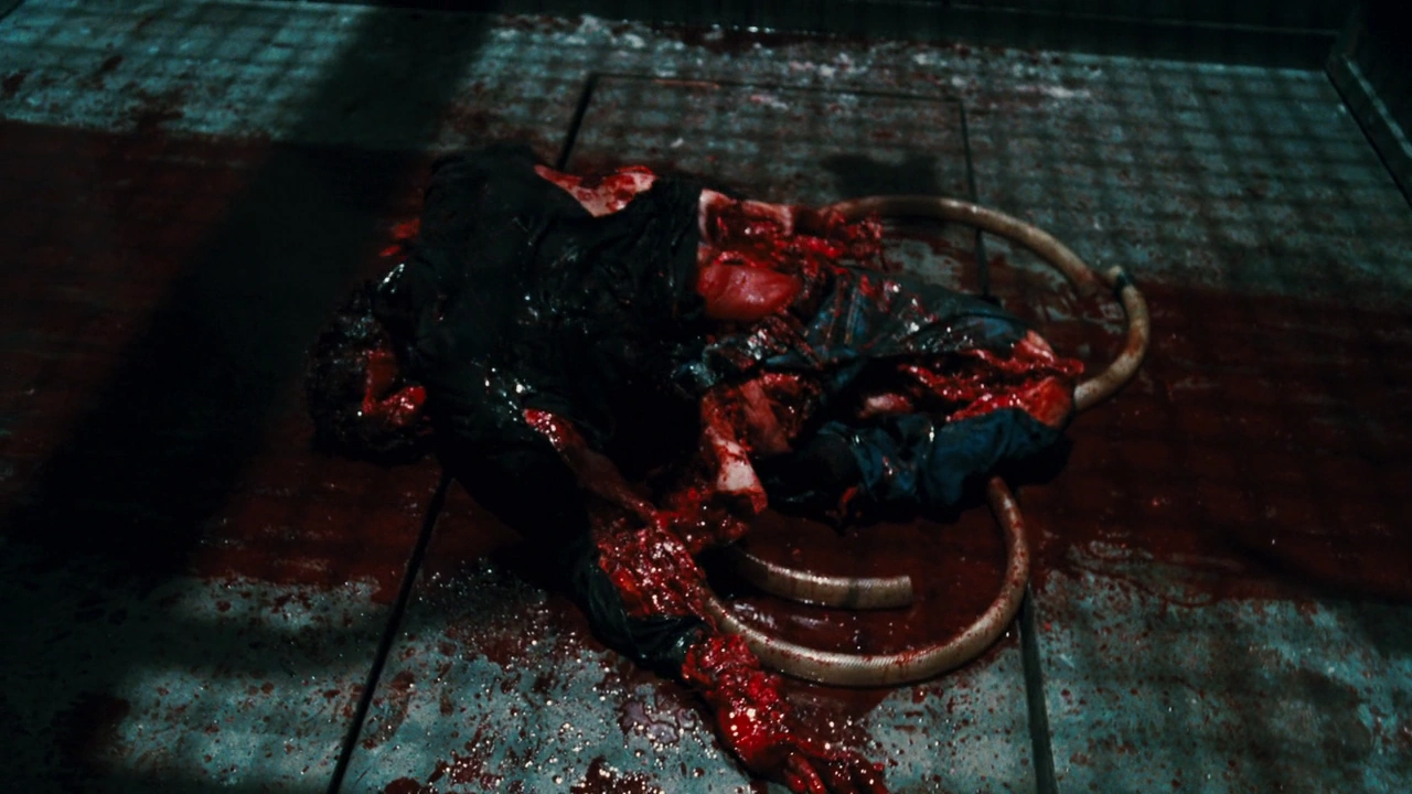 Following the massacre, Hoffman threw away his knife and ran out of the lab. Seconds later, he returned with the severed hand of Strahm, which he had kept in a cooling box in his car trunk, and a gas canister. He placed Strahm's fingerprints all around the room and also on Perez' gun as well as the screwdriver which he had used to cut off the power. Afterwards, he poured the gasoline all over the floor, the corpses and the technical instruments. When he approached Erickson, he briefly hesitated and smiled when he saw that the latter was still alive, before he poured the fuel over him as well. Then, Hoffman set the lab on fire before finally fleeing the scene. (Saw VI)