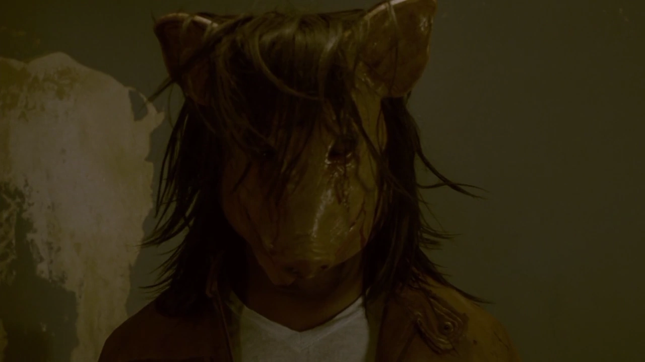 The original pig mask Jigsaw used to abduct his first victim was from a Chinese street festival which was celebrating the Year of the Pig and the mask was presumably made of rather cheap materials, unlike his later Pig Masks. It had big white eyes with long lashes, two red circles on its cheeks and white lips forming a cheerful grin. It also had a shock of pink, fuzzy hair.